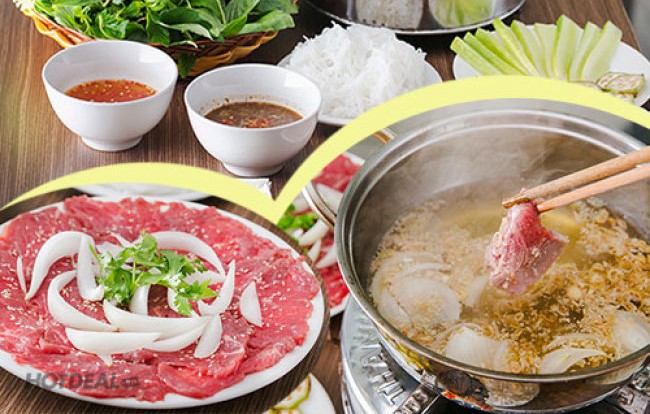 Nồi nước giấm sôi lăn tăn, thêm sả, tỏi, hành tím, và lát khớm thơm. nhúng lát bò tươi vừa chín tới, cuốn cùng rau, bánh tráng, và chấm măm nêm - ngon tròn vị , vui tròn bàn